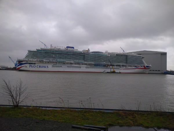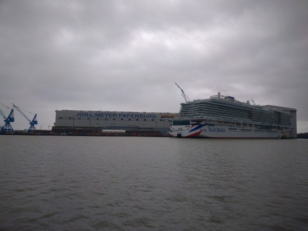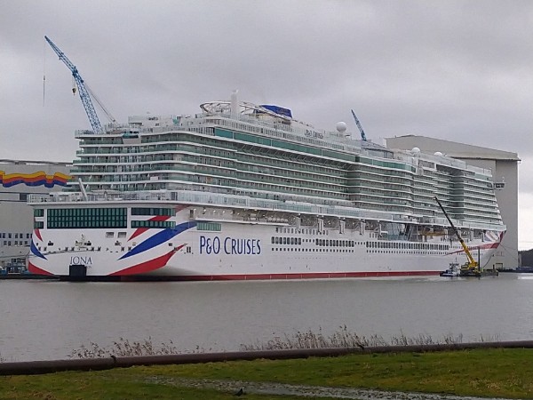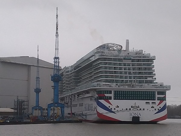 A few days after Iona docked out at the Meyer Werft in Papenburg, Germany, she is seen here during the outfitting stages. The date is the 19th of february, 2020 and the top of the funnel has still to be placed.