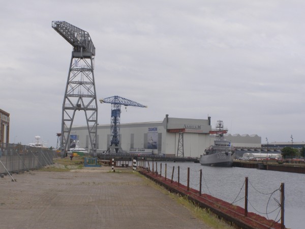 Aft of the old crane, the new Damen repairyards are shown. Here the yaughtbuilder Amels repairs the worlds largest private yaughts.